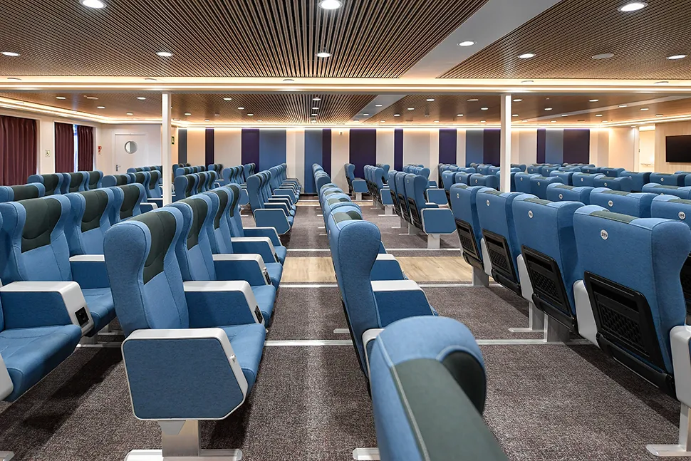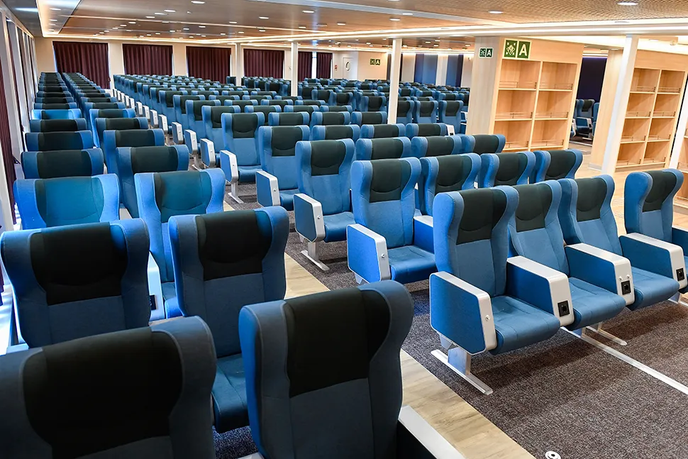 La sala poltrone ospita complessivamente 403 poltrone, tutte reclinabili ed accessoriate da prese di corrente e usb. Ampia l'area dedicata al deposito bagagli.