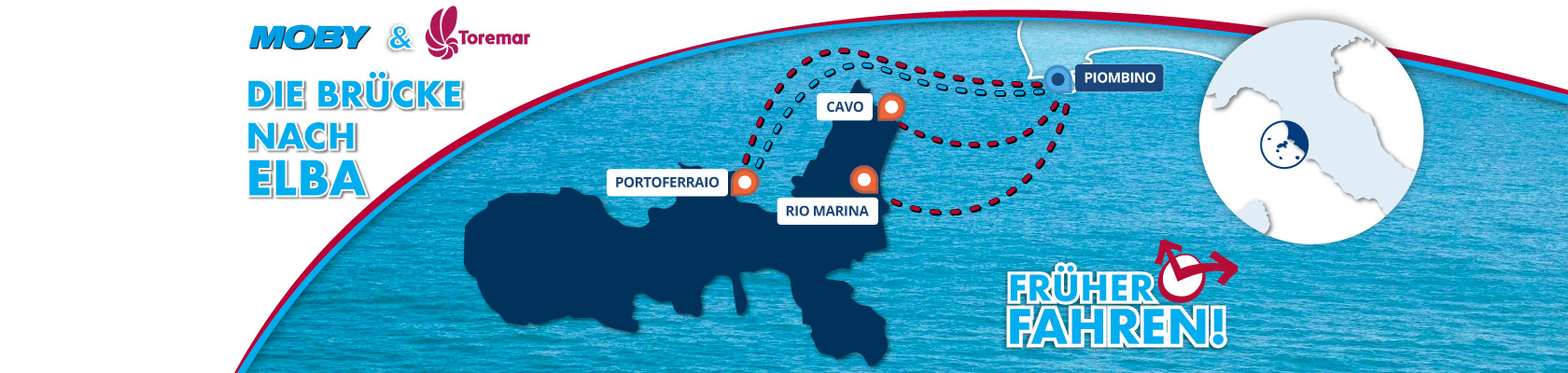 Ab heute gehört Toremar zur Familie MOBY! Das Angebot an Fährüberfahrten zum Toskanischen Archipel wächst. Ab jetzt können Sie online außer für die Insel Elba auch Tickets für die Insel Giglio, Capraia oder Pianosa buchen. Besuchen Sie die Webseite toremar.it/de und buchen Sie für die toskanischen Inseln.